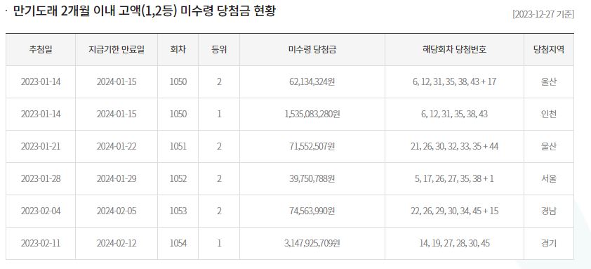 로또 복권 구매하시고 미수령하셔서 만기가 2개월 이내로 도래한 고액 당첨금이 있습니다 미수령당첨금의 금액 지역과 금액이 표기되어 있으니 꼭 확인해 보시고 국고로 환원되는 일이 없도록 살펴보시기 바랍니다.