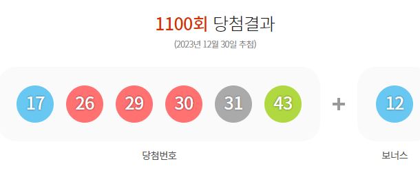 1100회차 로또 당첨번호는 17,26,29,30,31,43이구요 보너스 숫자는 12입니다 십자수 수가 하나도 없이 모두 두자리 숫자로만 이루어 졌습니다. 당첨되신분들 축하 축하